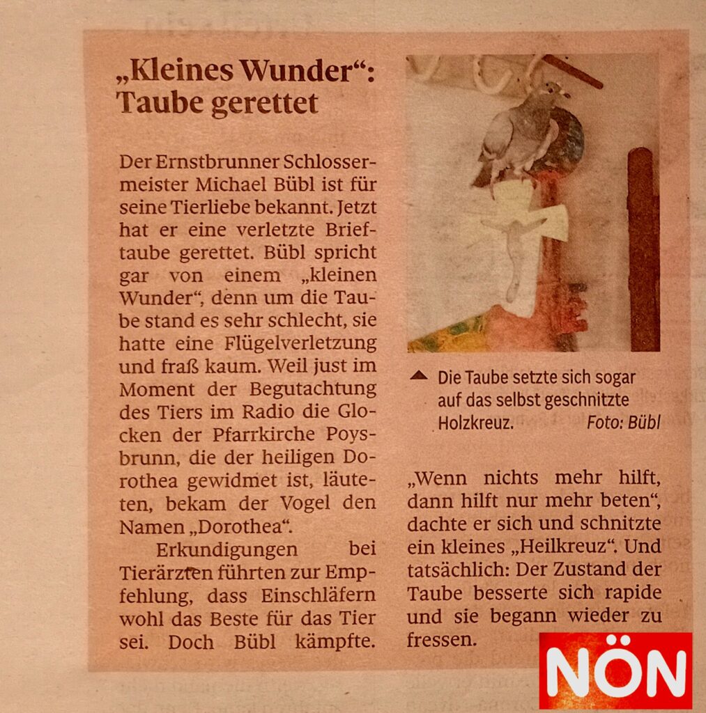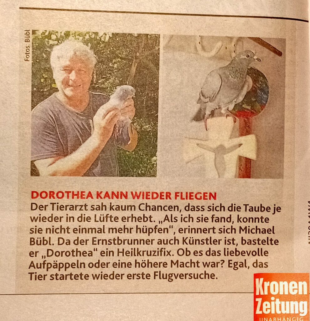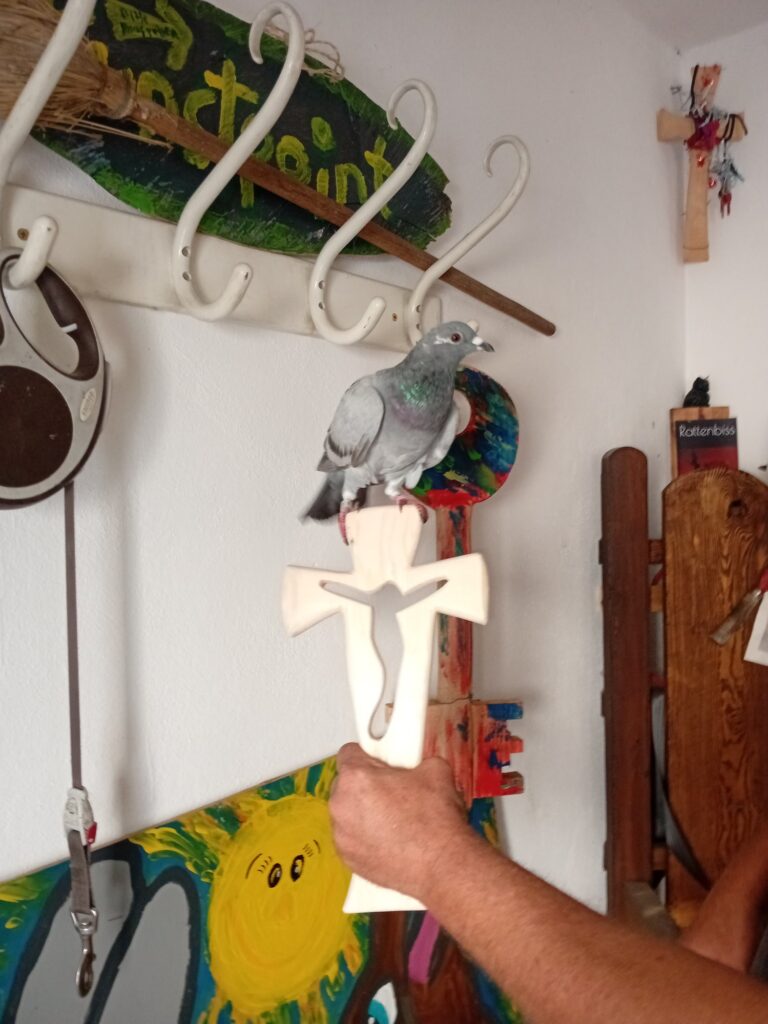 Eine schwerverletzte Taube wurde von allen aufgegeben und ihr Tod war nahe. Kein Tierarzt, keine gute Ratschläge konnten dem Tier mehr helfen. Da kam mir ein alter Spruch ins Gedächtnis: Wenn nichts mehr hilft, dann hilft nur mehr beten! Also machte ich mich auf in meine Werkstatt und schnitzte der Taube mit meinen von Gott gegebenen Händen ein eigenes Kreuz – ein Heilkreuz. Die Taube nahm das Heilkruzifix an und das Blatt wendete sich. Nach einigen Tagen begann sie zu fressen und ein Lebensgeist stellte sich ein. Wieder nach einiger Zeit konnte sie bereits die Flügel bewegen und danach sass sie bereits auf dem Heilkreuz – Ein Zeichen der Dankbarkeit! Interessierte Personen können bei mir ein Heilkreuz erwerben.